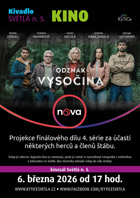 Kapacita kina je omezená, proto je nutné si vyzvednou vstupenku s místenkou v Infocentru ve Světlé nad Sázavou, tel.: 775 653 884.